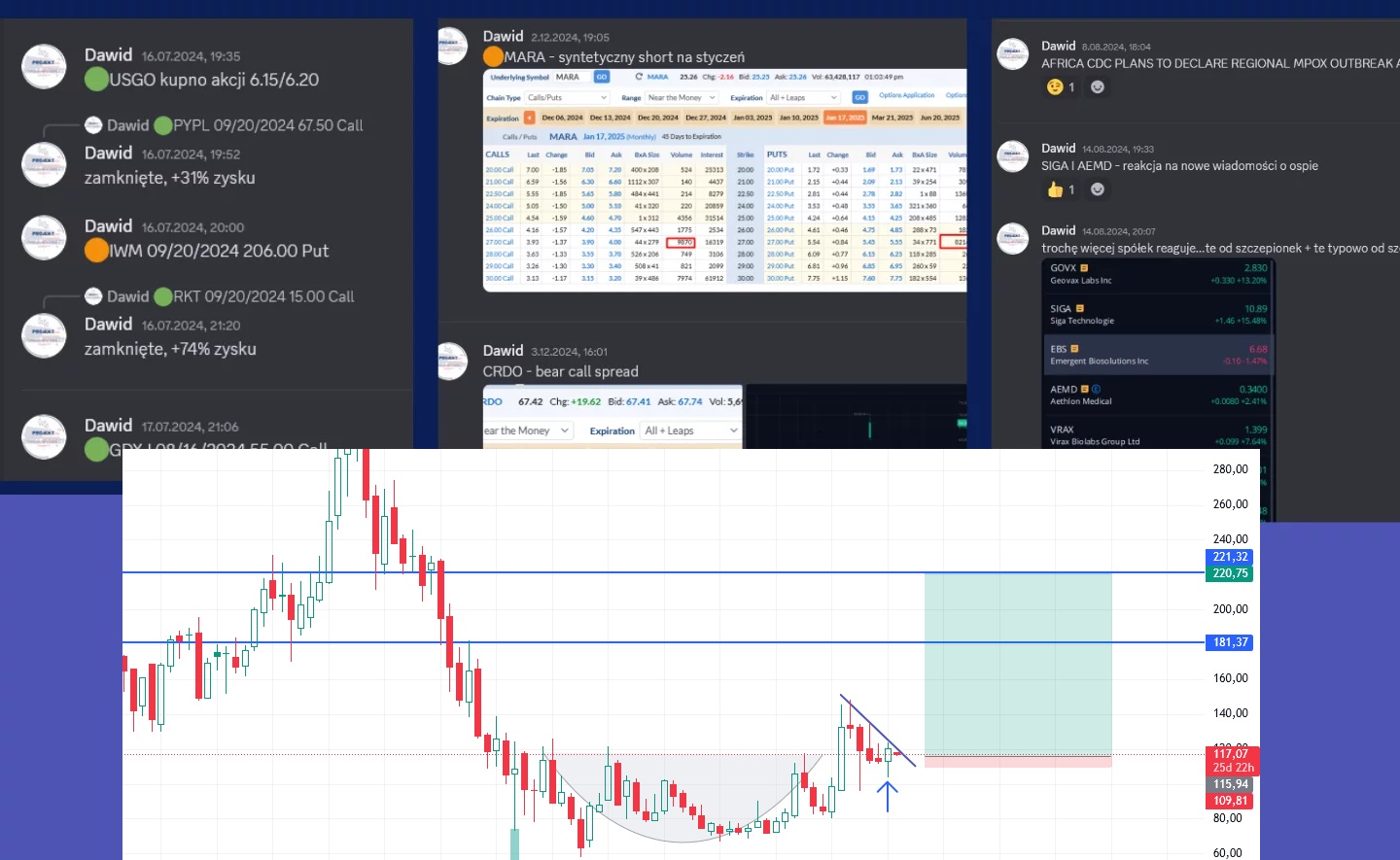 Wykupując wersję premium otrzymujesz dostęp do tej sekcji oraz zamkniętych kanałów na discordzie gdzie umieszczane są wszystkie sygnały w czasie rzeczywistym. Na kanałach odbywa się stała dyskusja z moim udziałem, dzielę się wiedzą i doświadczeniem. Dodaje istotne informacje ze świata giełdy, spekulacyjne sygnały, przemyślenia i inne istotne informacje, które poprawią Twoje umiejętności i wiedzę w tradingu.